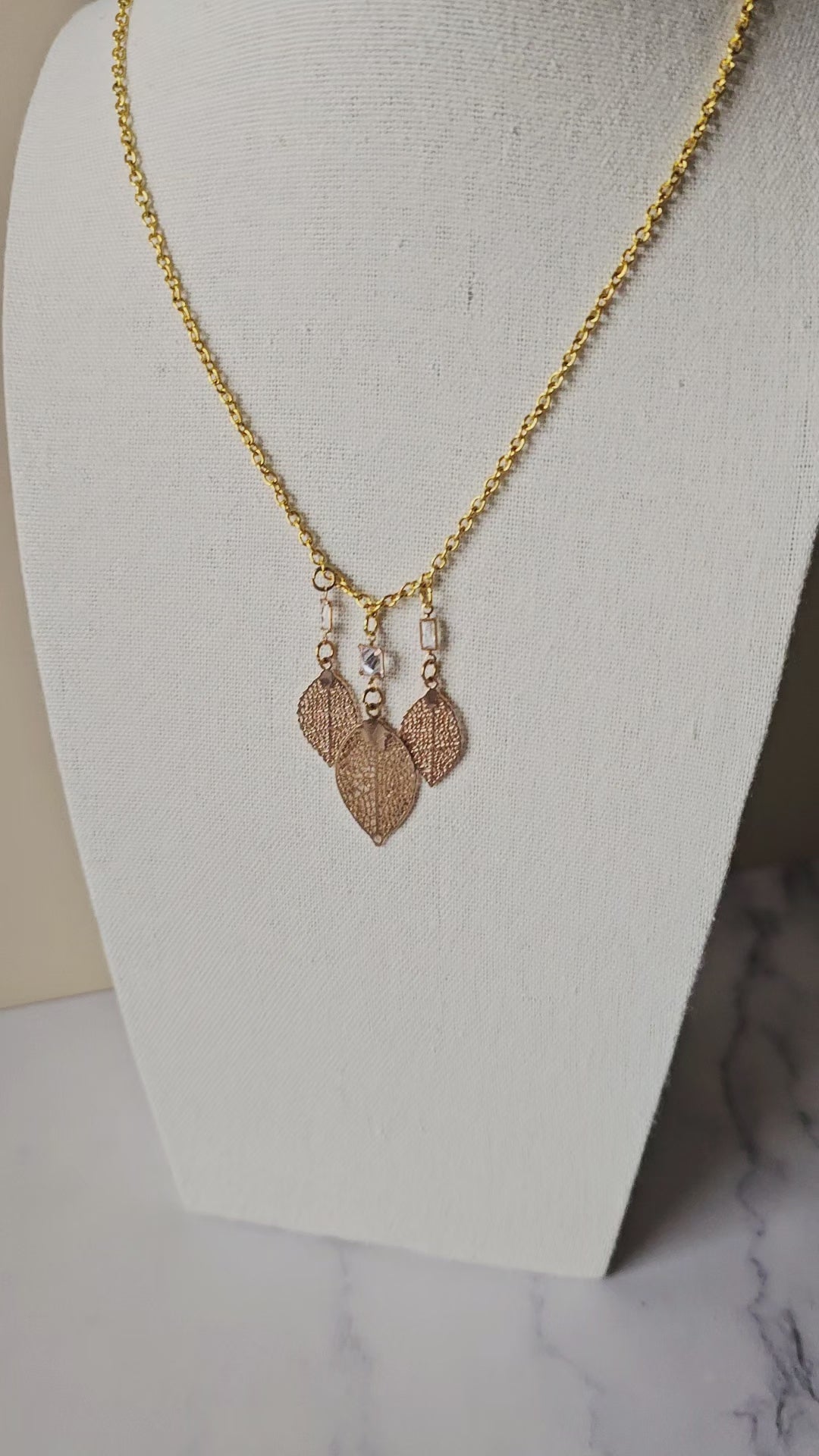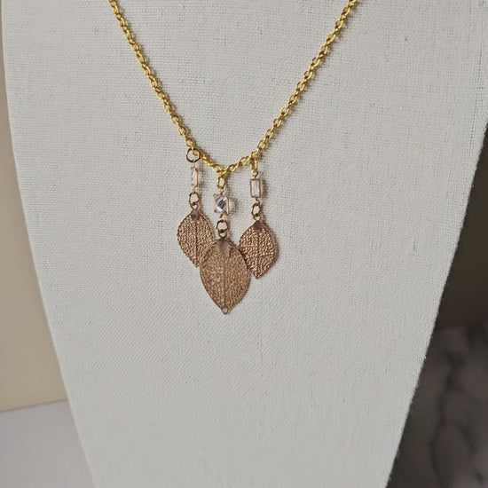 Bohemian Bling! Accessorize stylishly with this bright artisan 3-gold leaf and clear rhinestone necklace on a yellow gold chain. The largest leaf measures 1x.75" and all 3 are connected to a 22" chain, with a gold lobster clasp. Perfect also for that favorited eclectic friend!