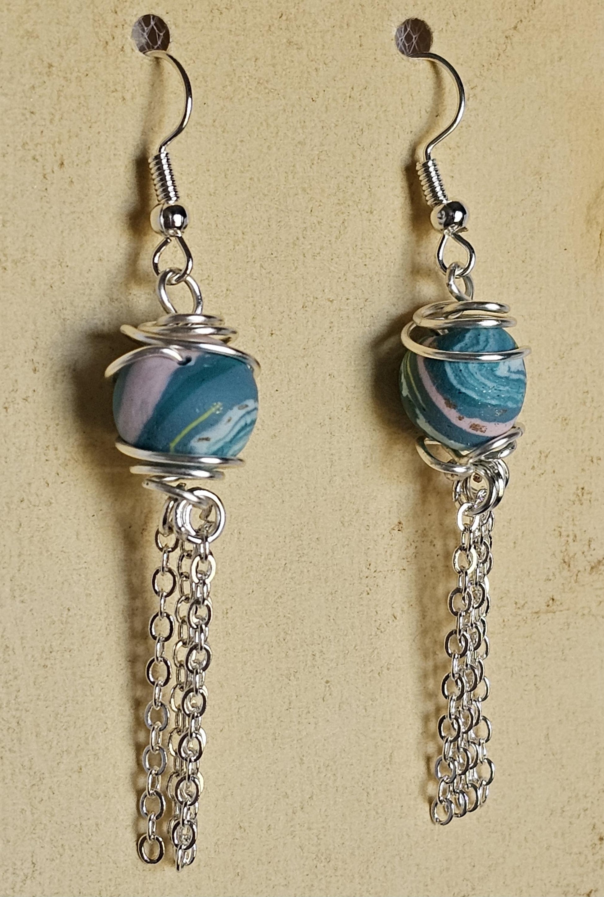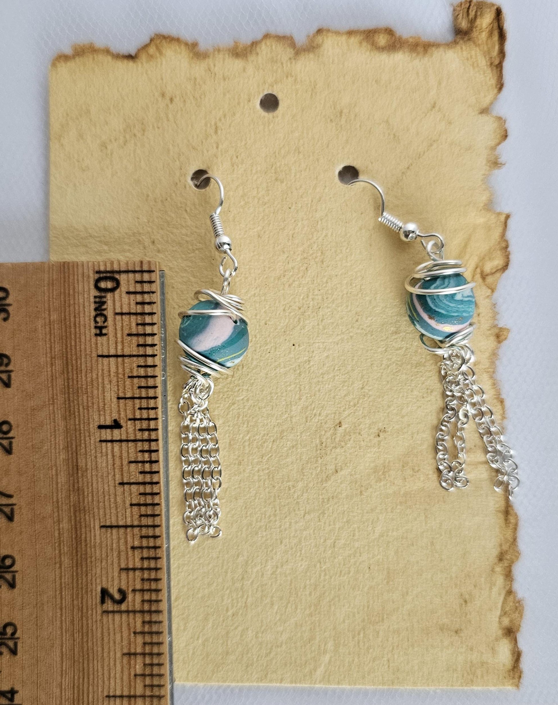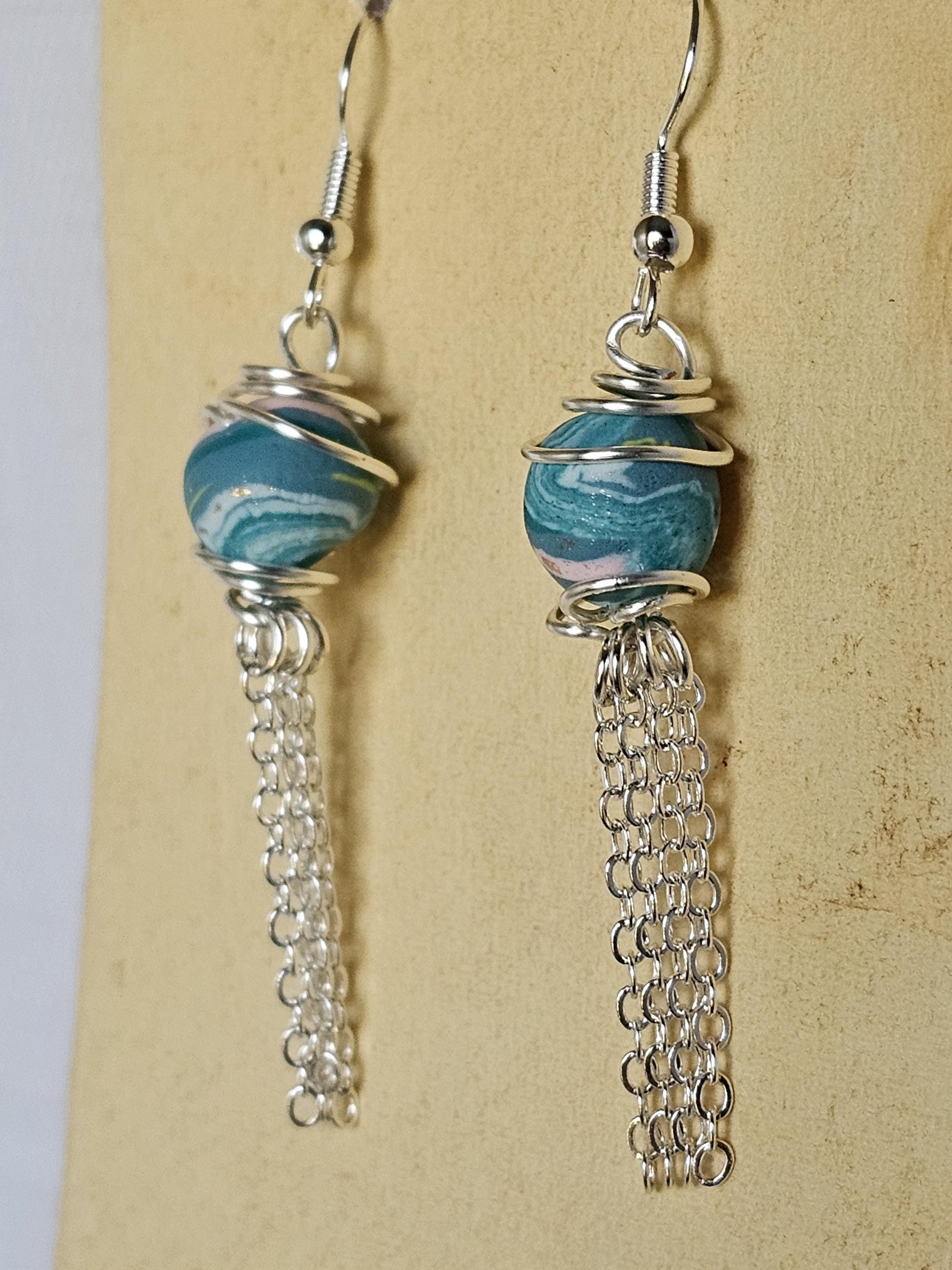 Add a pop of color to your outfit with these beautiful turquoise clay bead and silver tone wire wrapped earrings. These have a beautiful silver tone chain tassel, which make for a unique and stylish accessory. ●The earrings are 1.5 inches in length and have a 3/8 inch diameter. ●hypo allergenic silver tone hook ear wires ●FREE SHIPPING!! These handcrafted earrings are a must-have for any artisan jewelry enthusiast. *Item will be shipped USPS ground advantage unless otherwise requested.