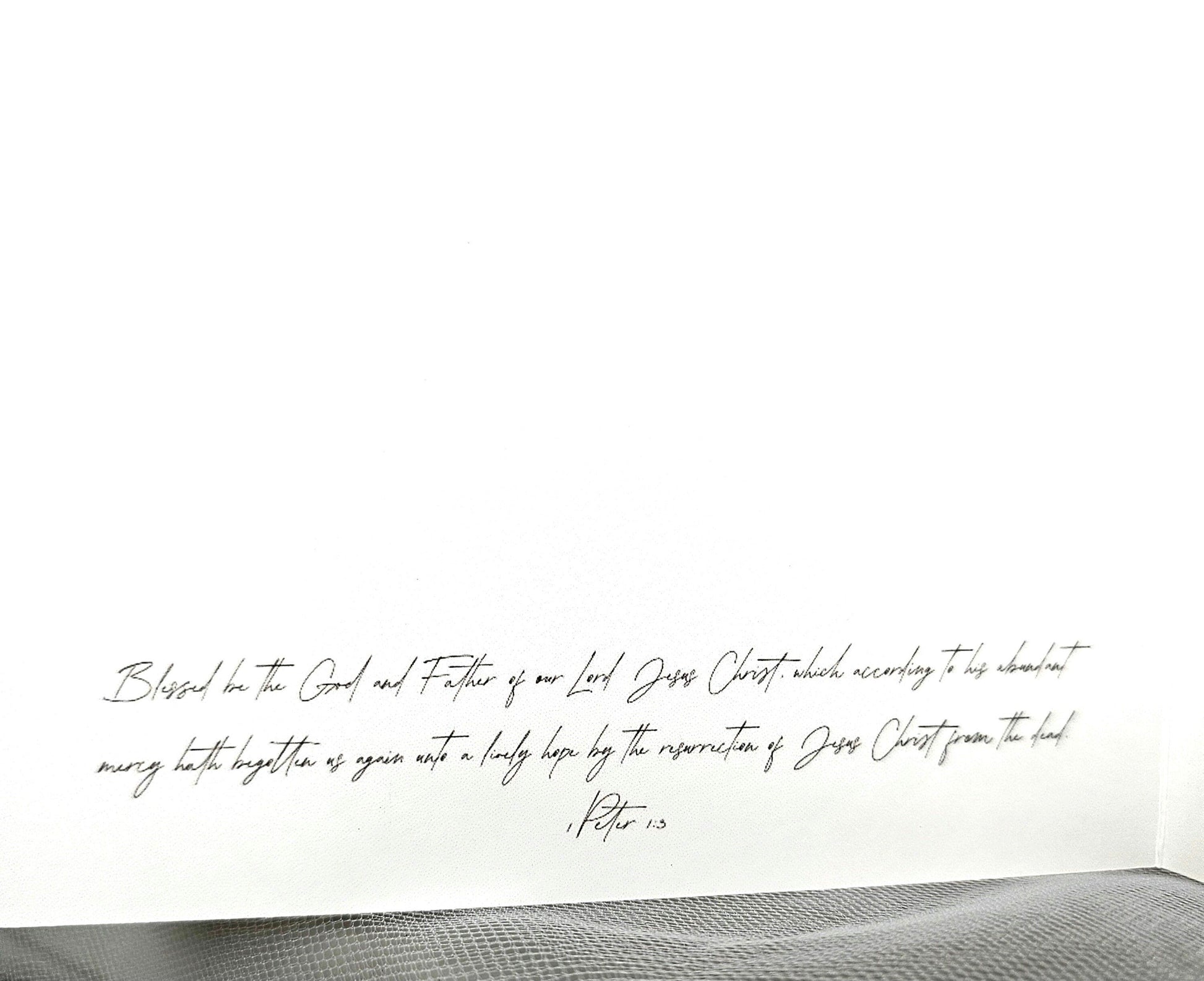 Inside left verse: 'Blessed be the God and Father of our Lord Jesus Christ, which according to his abundant mercy hath begotten us again unto a lively hope by the resurrection of Jesus Christ from the dead.' 1 Peter 1:3