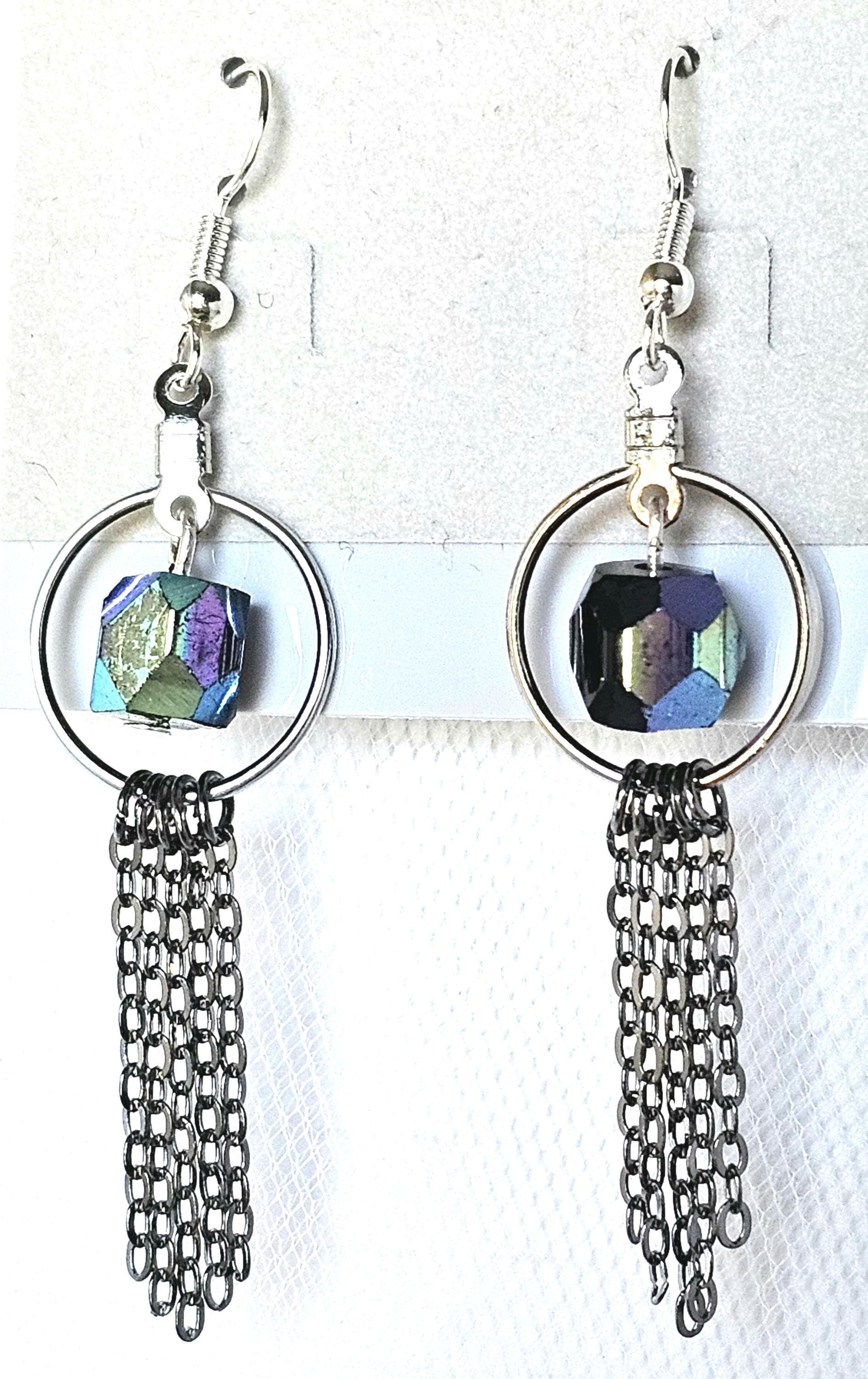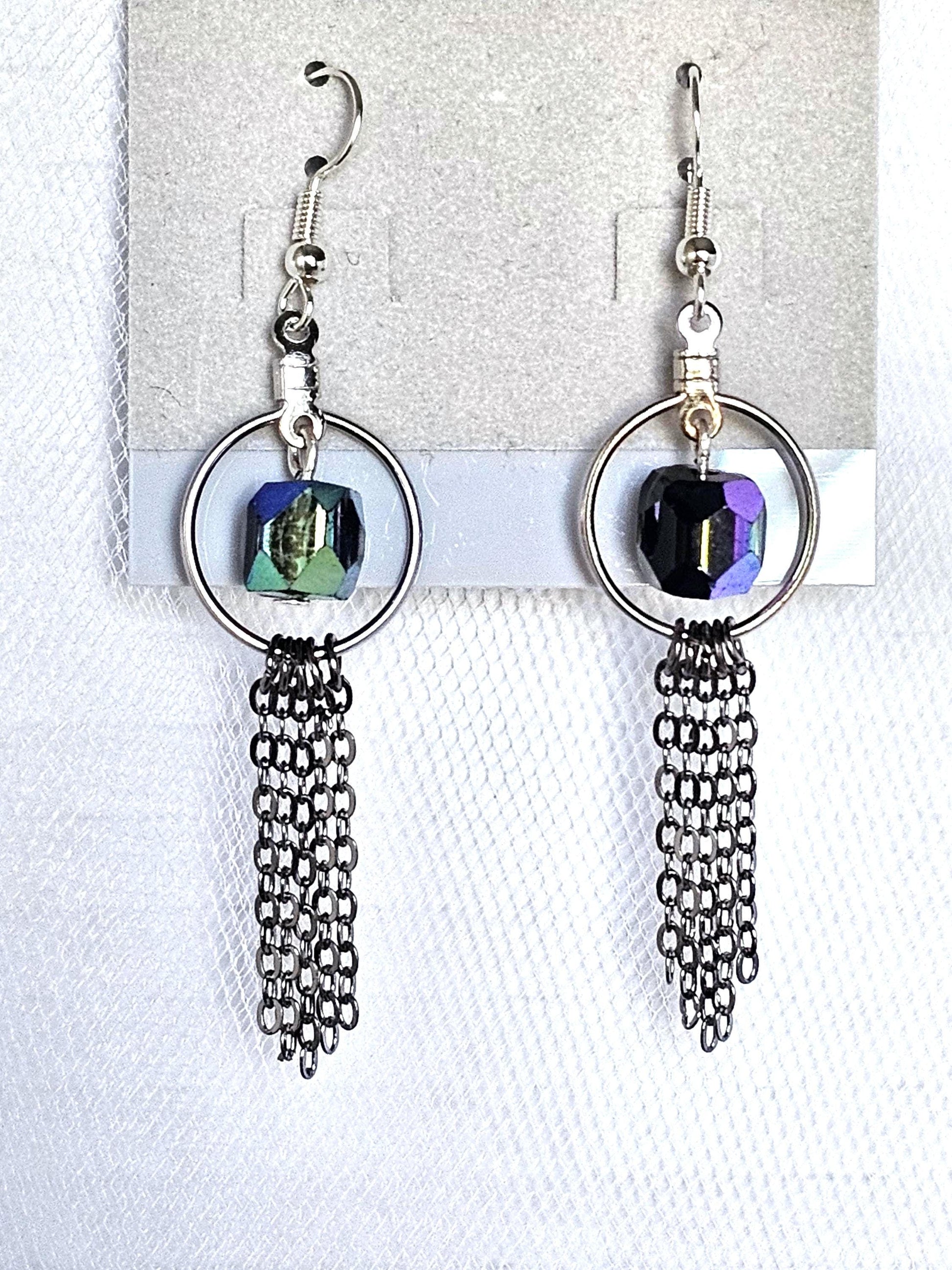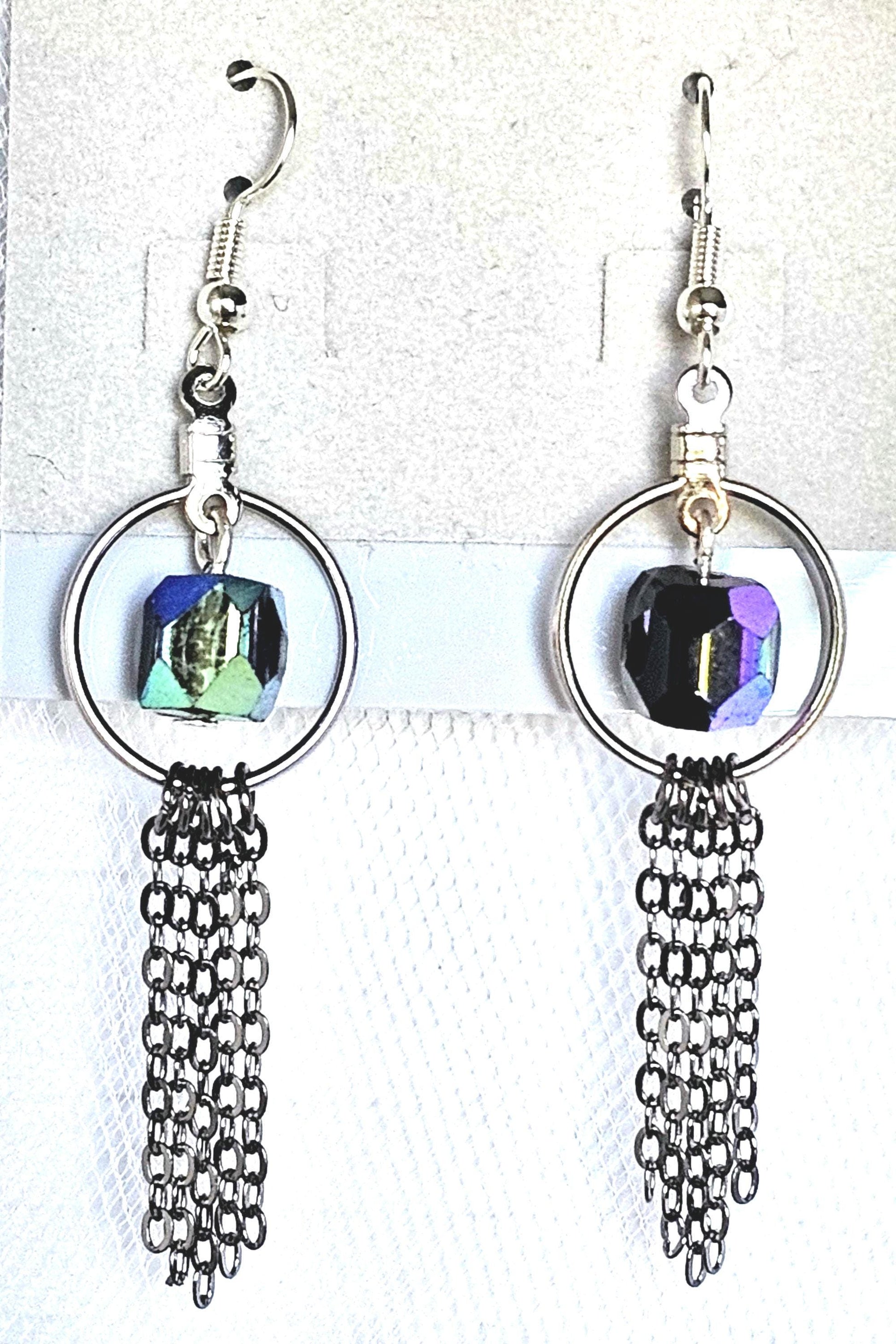 Elevate your style game with these stunning black iridescent beveled silver tone hoop earrings with dark silver tone chain fringe. The earrings feature hypo allergenic earrings wires and are handmade with care in the United States. With a length of 2 inches and width of .50 inches, these earrings are perfect for everyday wear or special occasions. These earrings are a must-have for any fashion-forward individual who wants a classy yet casual addition to their wardrobe. **FREE SHIPPING!!*Item will be shipped USPS Ground Advantage unless otherwise requested