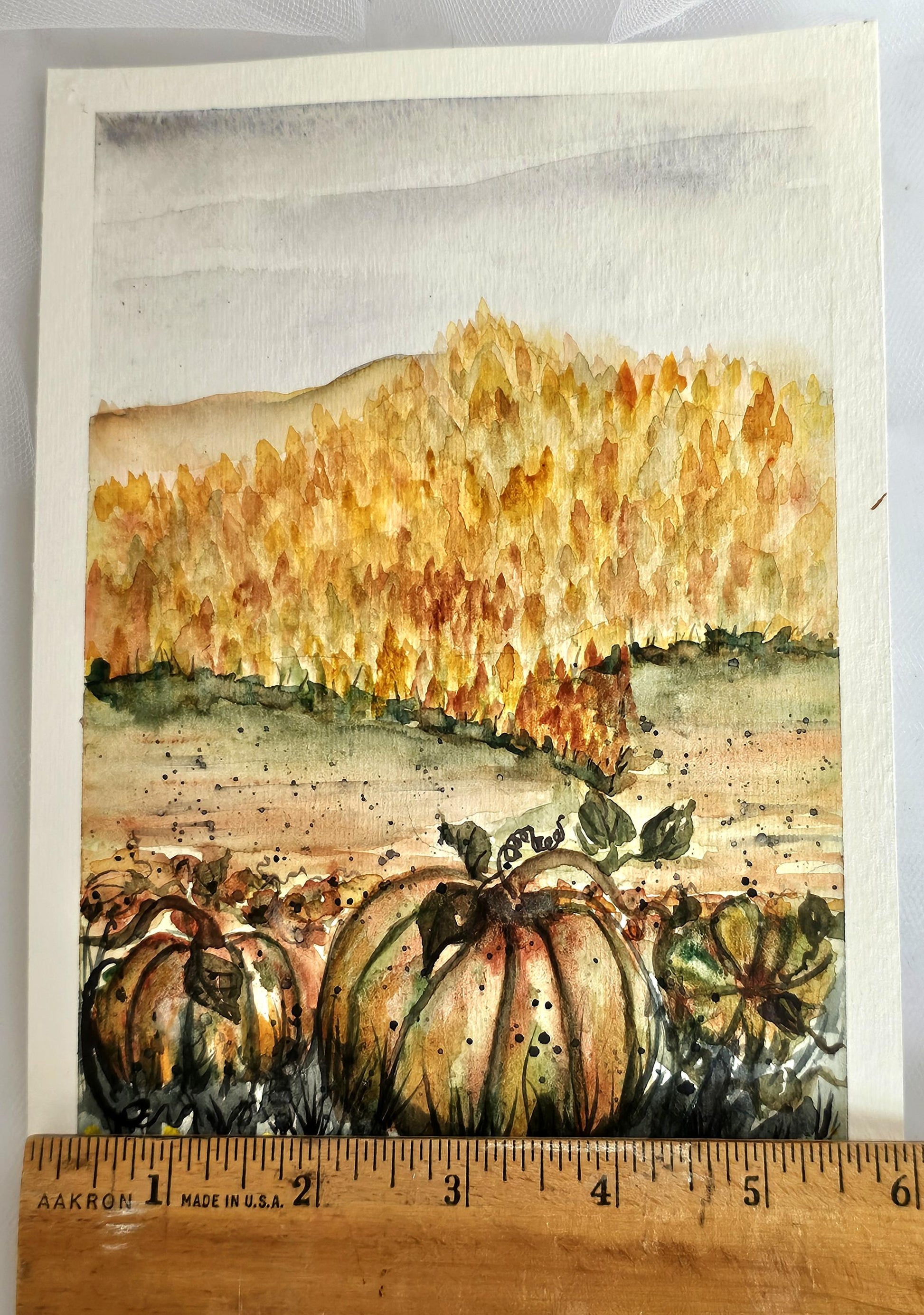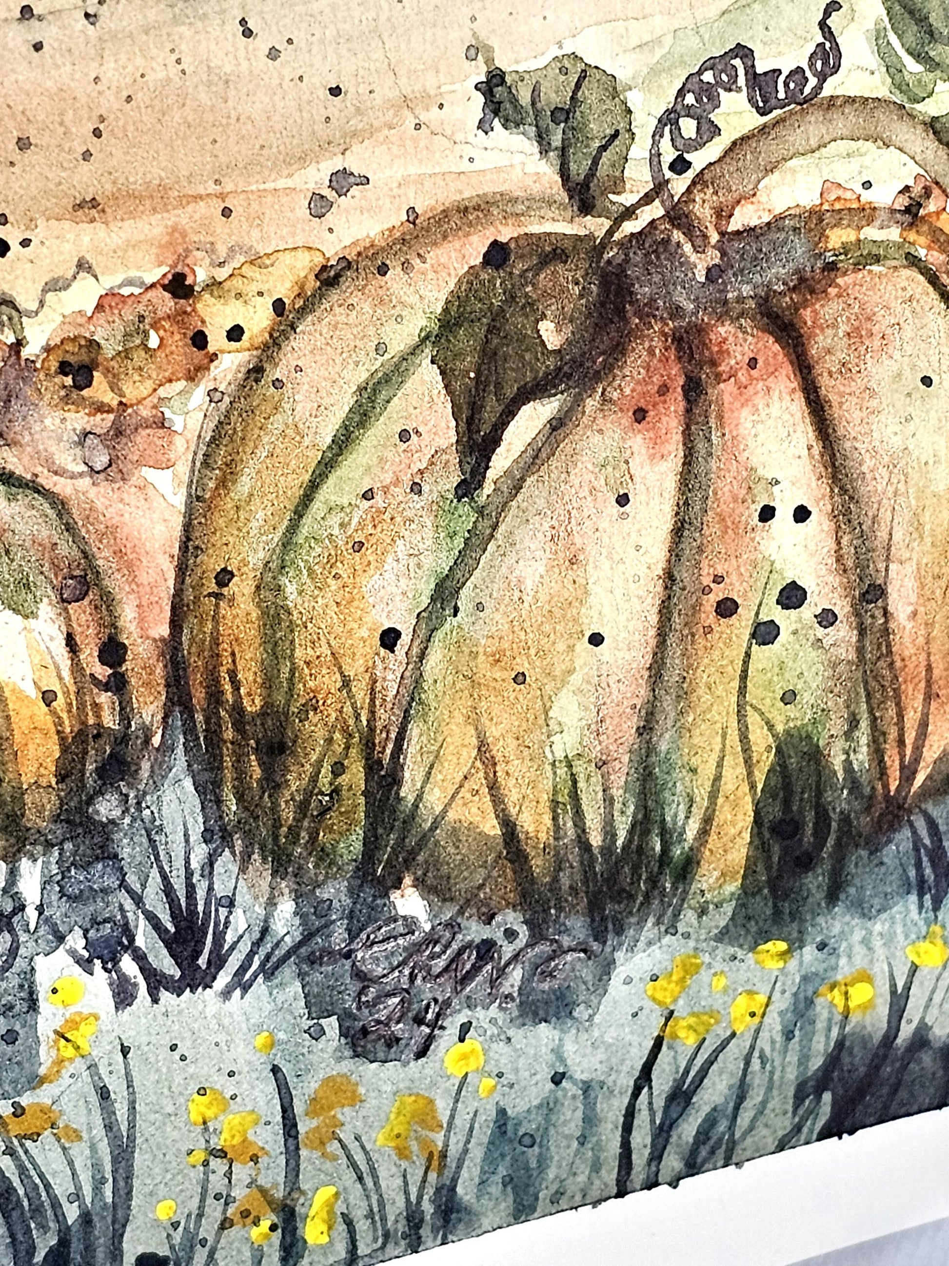 Original Watercolor Art Painting 'Pumpkins in a Field' Unframed 9x6 Autumn Fall Theme