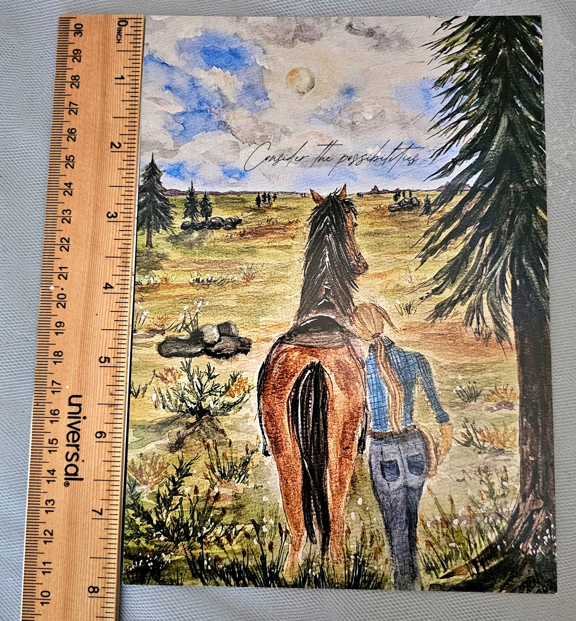 This beautiful set of 5 watercolor print notecards is a perfect way to express your feelings for any occasion. It features the inspiring message "Consider The Possibilities" featuring a cowgirl with her horse looking at the vast landscape ahead of them. The card measures 5.5x7.5 inches and comes with a white envelope. You can personalize it by adding your own message on the other side of the card. Whether you want to send it as a thank-you note, a birthday card, or just a simple message of encouragement, this card is a great choice. It was designed and painted by Erin Powers in 2023. Share the joy of this beautiful notecard with your loved ones today! **CONDITION: Newly printed **SHIPPING: FREE *Item will be shipped USPS First Class unless otherwise requested.