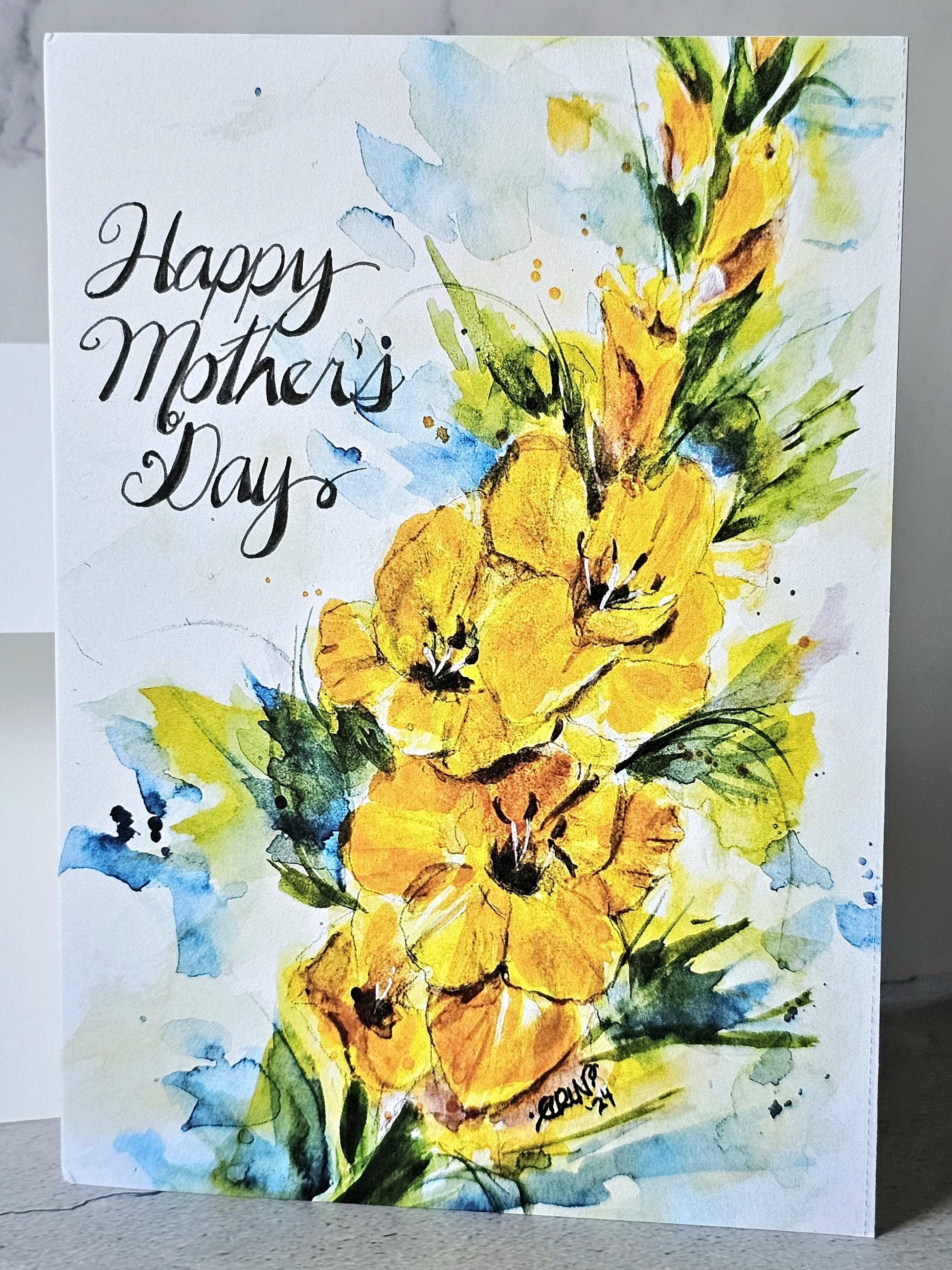 Make Mother's Day stand out this year with a unique original art print card that shows a beautiful yellow gladiola stalk. Designed by artist Erin Powers in Alabama, the original art painting was created in 2024, and the card is signed by the artist. *5x7 size *Includes white envelope *Blank Inside *Front side message: Happy Mother's Day *SHIPPING: FREE *Item will be shipped USPS First Class unless otherwise requested . **Volume discount applies.