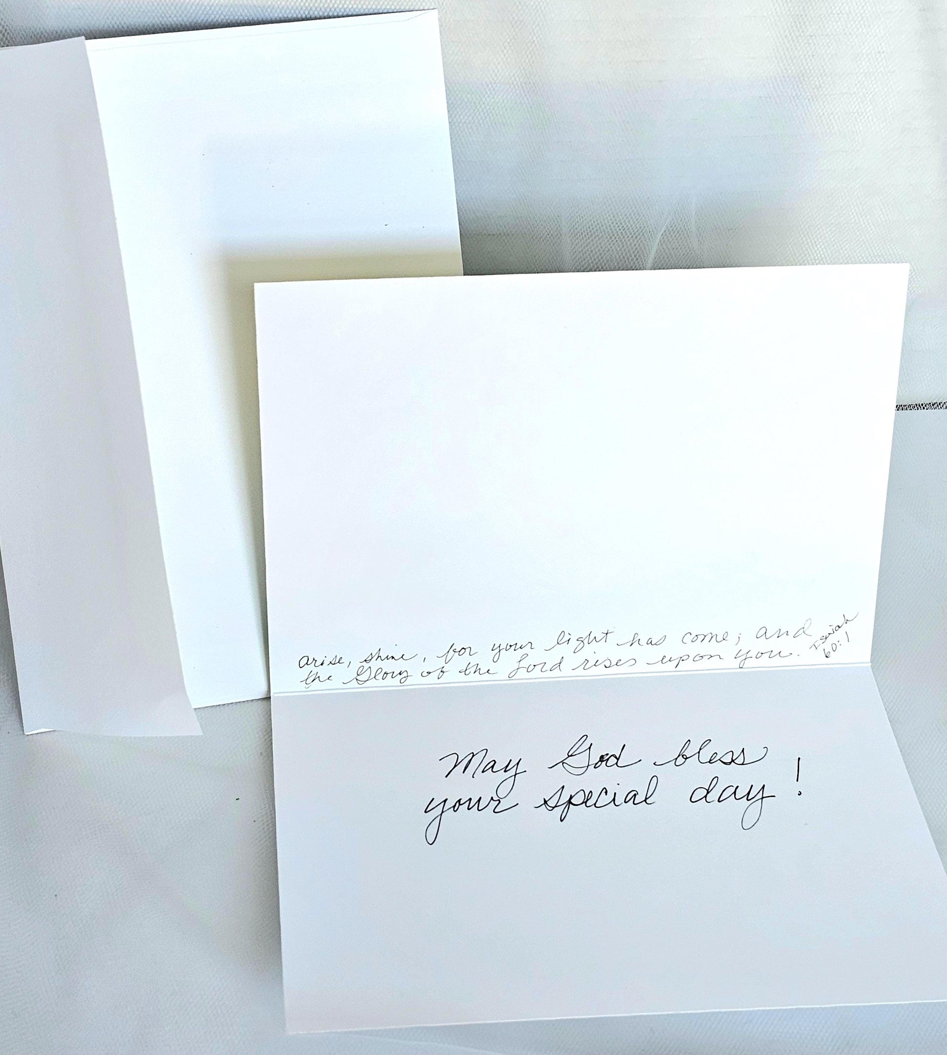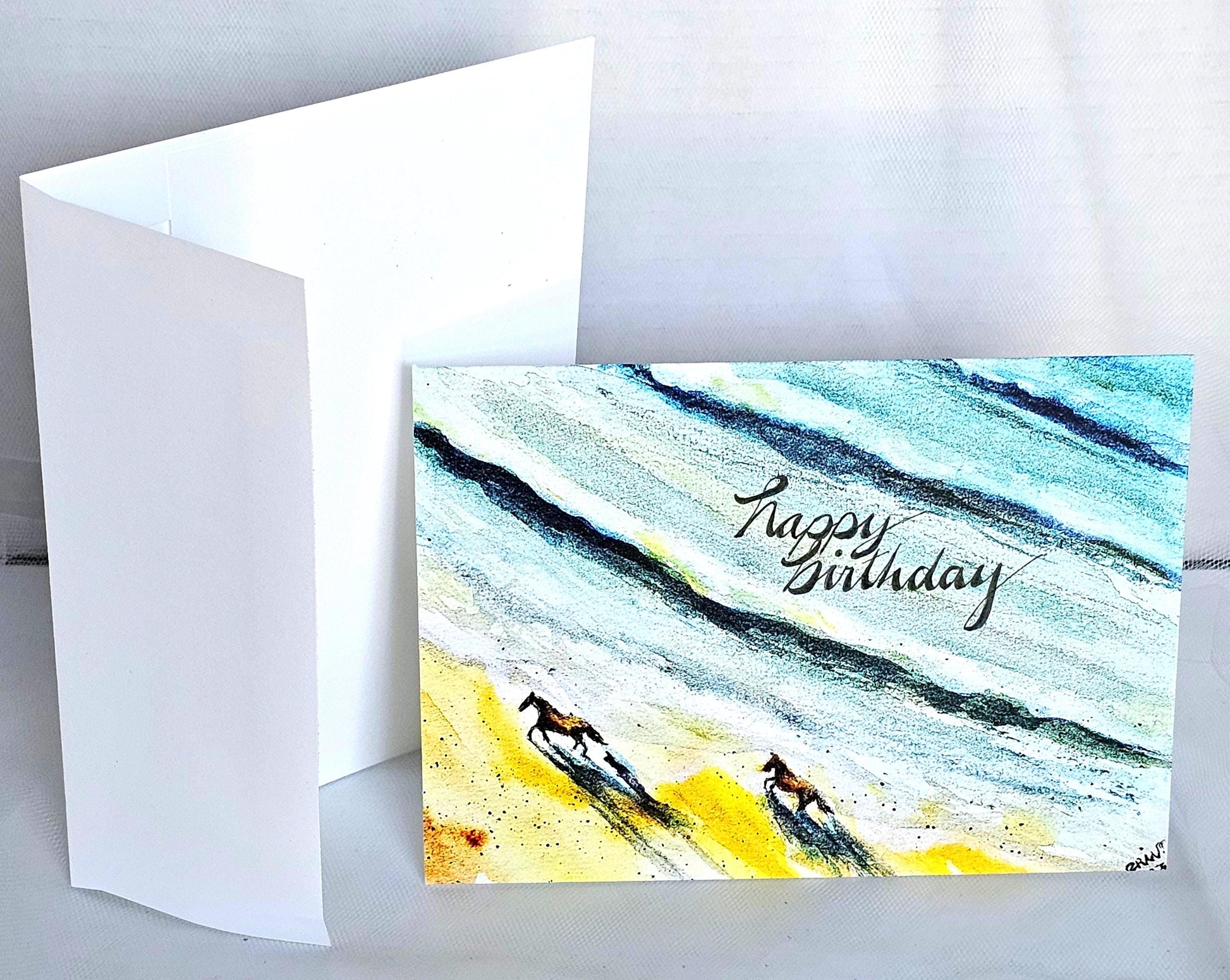 Celebrate a loved one's special day with this beautiful Christian watercolor original art print greeting card. Featuring a stunning image of horses on a beach, this card is perfect for any animal lover. Original art was designed and painted by Erin Powers. *Front saying: Happy Birthday *Inside top saying: Isaiah 60:1 bible verse *inside bottom saying: May God bless your special day! Measuring 5 inches in height and 7 inches in width, this folded card is ideal for any recipient, whether it's a friend, family member, or colleague. The card is suitable for any occasion, especially birthdays. So, why not make someone's day and send them this lovely birthday card? **FREE SHIPPING!! * *Item will be shipped USPS First Class unless otherwise requested.
