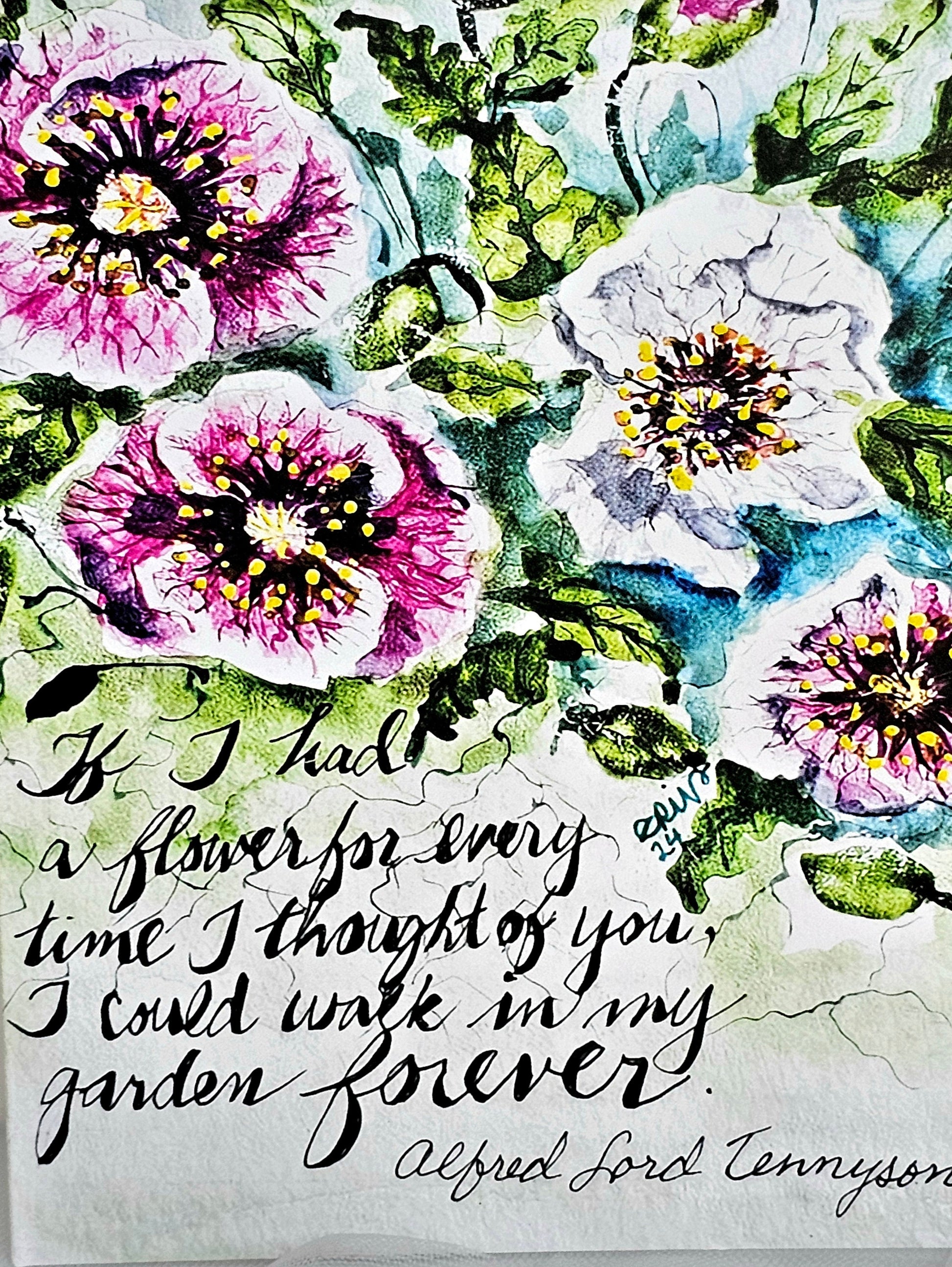 This beautiful watercolor original art print card titled 'Poppies' is the perfect gift for a wonderful friend or as a simple art piece to hang in any room of your home. The card features a stunning painting of poppies and comes with a special saying for friends by Tennyson that adds a personal touch. The card was originally painted and designed by Erin Powers and is ideal for any occasion. This card is perfect for those who appreciate unique and beautiful pieces of art, or a unique gift for that special friend. The card measures 5.5x7.5. *Saying On the front: If I had a flower for every time I thought of you, I could walk in my garden forever. ' by Lord Alfred Tennyson **FREE SHIPPING!! *Item will be shipped USPS First Class unless otherwise requested.