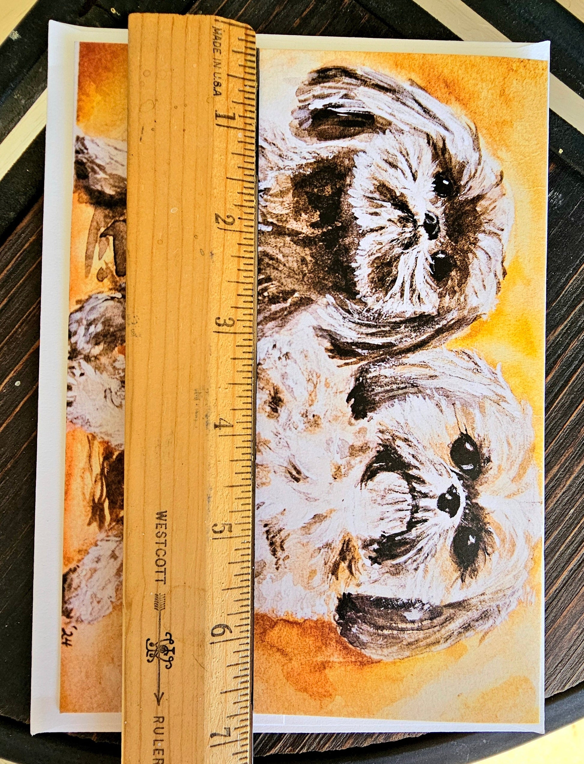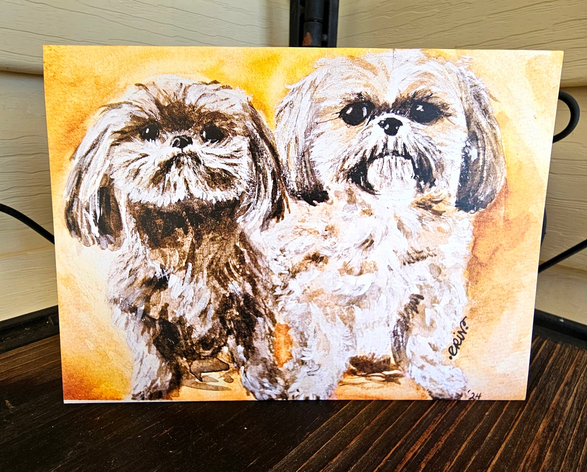 This beautiful Watercolor Print Greeting Card features adorable Shih Tzu Pups and is perfect for any occasion, and lovers of Shih Tzus, or any dog breed. The card is folded horizontally, and blank inside, making it versatile for any message you want to convey. The artist-designed card by Erin Powers was produced in Alabama using watercolor technique. The original was created in February of 2024. It comes with a white envelope and measures 7 inches in height and 5 inches in width. The card's contemporary style and animal print make it a great addition to any home. Give a special message to your loved one with this multipurpose greeting card, or frame and hang as a gift or for yourself! *Item will be shipped USPS First Class unless otherwise requested. **FREE SHIPPING!**